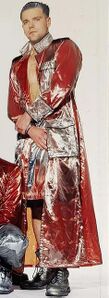 Shiny red coat, silver skort, black boots