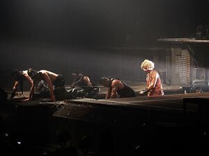 | At the beginning of the song, Richard would be the only one on stage. A sky-bridge would be lowered down and on the bridge would be Schneider dressed as a woman, with the other bandmembers on leashes, crawling on all fours. While they traveled to the stage, Schneider would often hit the others with a small whip and he would kick Paul from the bridge onto the stage. |
