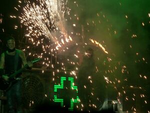 | Before the last part of the song, a green curtain of flames would ignite at the front of the stage. This effect originates from the Sehnsucht Tour. |
