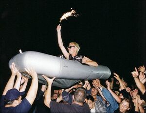 | At some point during Seemann, an inflatable boat would be brought on stage. Flake would get in it with a bottle sparkler, but from 1998 onwards there would be no bottle sparkler present. The boat would be passed to the crowd where Flake would spend some time sailing until eventually returning. During Heirate mich, the song would be extended before the last refrain and Paul would enter the inflatable boat for a short while before returning to the stage, except for once on 23 September 1998 where Flake was in the boat instead. | |