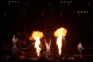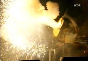 | After the intro, Till would jump onto the stage with set off sparkle fountain fireworks attached to his boots. There is one known time it was used for Engel in which Schneider used one boot instead of two and danced around while it went off during the solo. | |