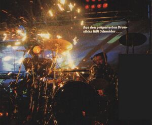| For the second guitar solo, Schneider would replace one of his drumsticks with a sparkle fountain firework, which would be set off. | |