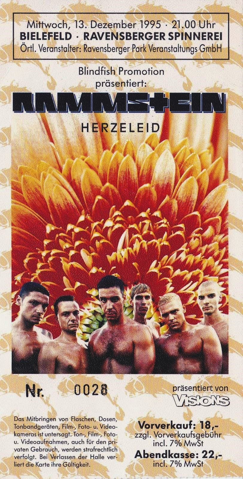 - ↑ RA-Forum.com post: "Ich war bei Rammstein in Bielefeld in der Ravensberger Spinnerei 1994 (!?). Es war ein echt heisses Konzert aufgrund des Flammenwerfers über den Köpfen." (Note: since the earliest known use of the flamethrower effect was in 1995 November it is assumed that the attendee was talking about this concert, at that time the effect was used only during "Wollt ihr das Bett in Flammen sehen?".) Retrieved 5 February 2019