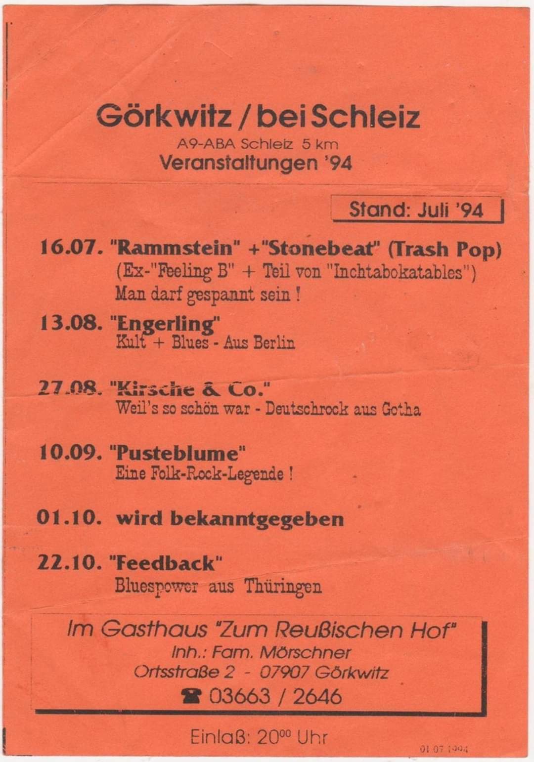 "So war es auch am 16. Juli 1994 beim ersten, von 200 Gästen besuchten Rammstein-Auftritt im Görkwitzer Gasthaus ,,Zum Reußischen Hof"." - ↑ Confirmed by an attendee.