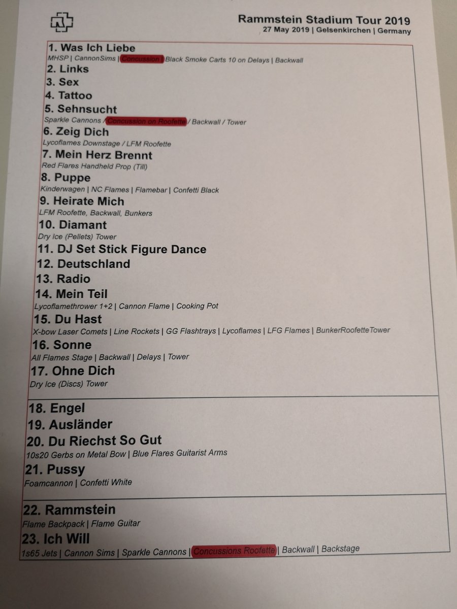 • Unlike the two rehearsal shows on 24 and 26 May Du riechst so gut was played before Pussy.
