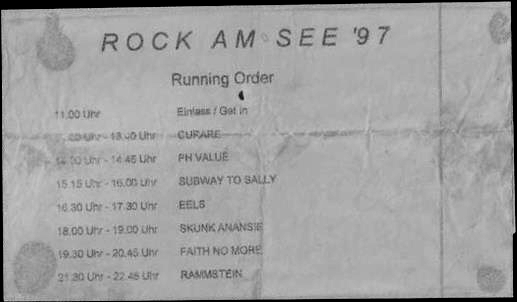• Apparently, there is an audience video recording of this concert somewhere, however only short snippets of Bestrafe mich, Du hast and Sehnsucht are currently available.