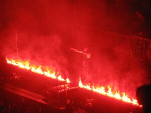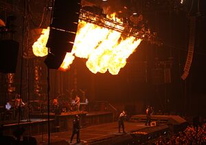 | During the chorus, flamethrowers mounted at the bottom and top of the stage would shoot flames out. On the "Heya" the bottom flamethrowers would activate, on the "Nein" it would be the top ones. |