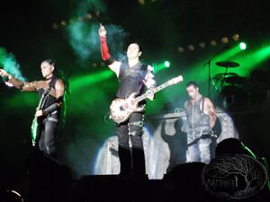 | During the guitar solo, Paul and Richard would go to the middle of the stage. A metal sleeve with several tubes mounted to their right arms would start to produce small flames whilst playing. |