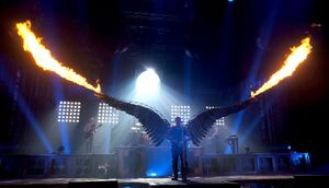 | Till would come out to play the song with giant wings on his back. After the first verse, they would usually unfold open and heat up and afterward shoot out flames during the whistling part. After the instrumental break, strobing fireworks inside of the wings would go off. |