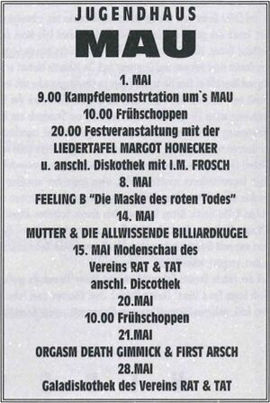 | 1993-05-21 | Jugendhaus M.A.U. | Rostock | Germany | First Arsch also played | |
