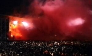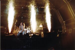 | This stunt would only be used at open air venues or in big concert halls. Technicians would place some smoke bombs that would go off halfway through the song, the generated smoke would be blown away towards the audience with big fans. The stage would barely be seen behind the smoke at some point. | |
