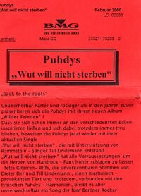 Unüberhörbar härter und rockiger als in den Jahren zuvor präsentieren sich die Puhdys mit ihrem neuen Album Wilder Frieden! Dass sie sich schon immer an den verschiedensten Ecken inspirieren ließen und sich dabei trotzdem immer treu blieben, beweisen die Puhdys jetzt wieder mit ihrer aktuellen Single "Wut will nicht sterben"‚ die mit Unterstützung von Rammstein-Sänger Till Lindemann entstand. "Wut will nicht sterben" hat alle Vorraussetzungen, um die Herzen von Hardrock-Fans höher schlagen zu lassen: fette Gitarren-Riffs, die unverkennbaren Stimmen von Dieter Birr und Till Lindemann, einen martialisch-provokanten Text und trotzdem, verbunden mit den typischen Puhdys-Harmonien, bleibt es aber unverwechselbar ein Song der fünf Berliner Rocker. |